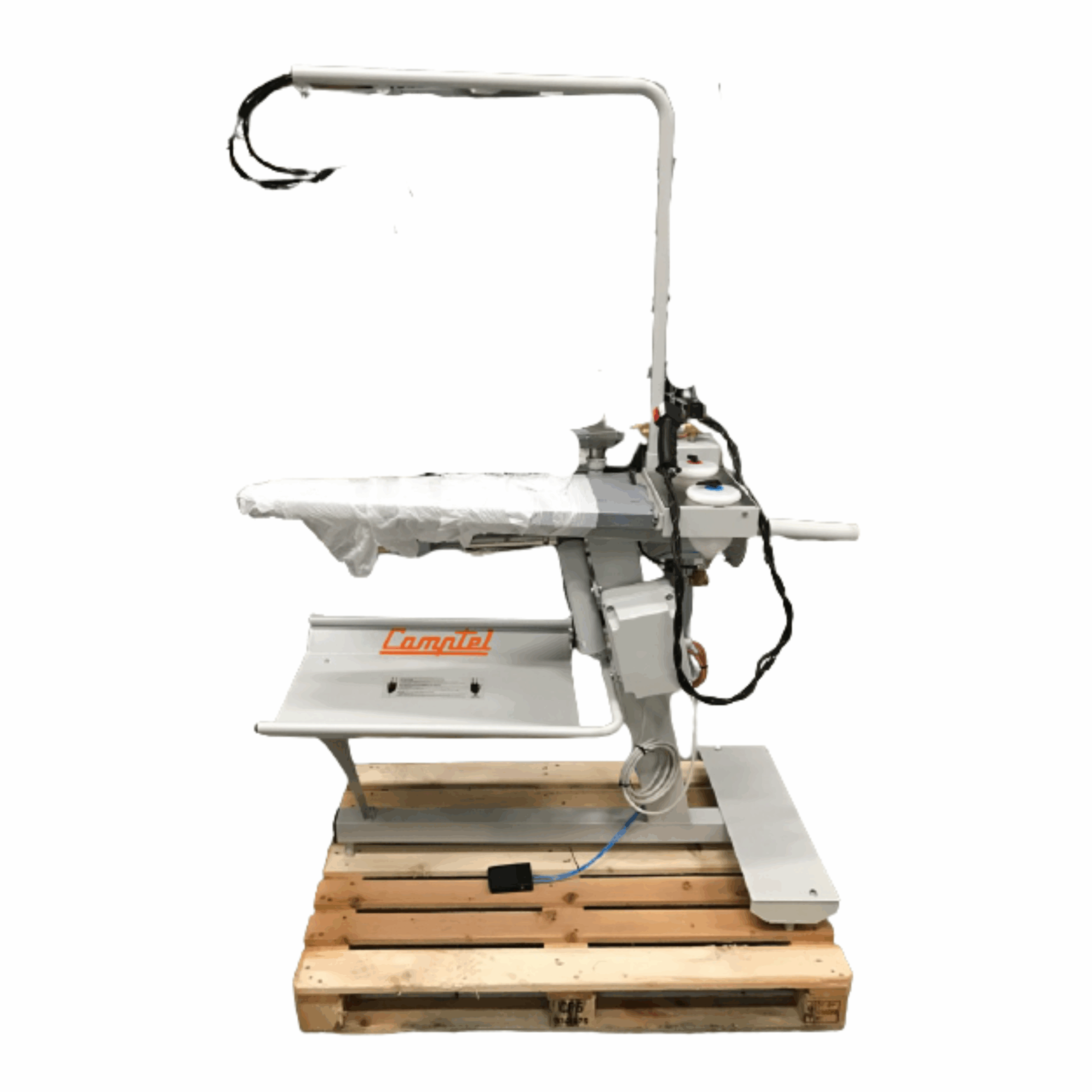 CAMPTEL model 452V-01A “Technomatic” fully automatic utility Press (47”), pedal controlled press head with built in vacuum, flap action device, head protection safety bar, buck shape 01A (utility shape), complete with all-steam iron, Teflon shoe and iron rest. 220/60/3. UL / ETL approved.