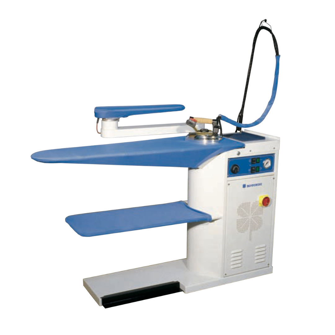 ROTONDI model PVT 38 Ironing table with specifications as follows: • Electric heated, 5 kW element • Self-contained • Built-in vacuum, 0.80 HP motor • Built-in steam boiler, 8 lt. capacity • Water feed pump • Includes model EC-420 Electric steam iron • 208/60/3 • UL / ETL approved